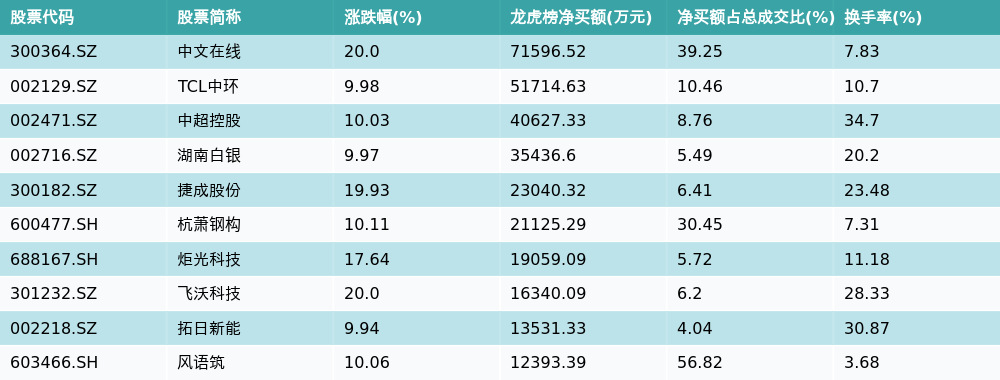 南财智讯2月9日电,盘后数据显示,因当日异动登上龙虎榜的个股中,资金净买入最多的前三位分别是中文在线(300364.SZ)、TCL中环(002129.SZ)与中超控股(002471.SZ)。其中排名第一的中文在线净买额达7.16亿元,占总成交金额的39.25%。中文在线当日收盘上涨20.0%,换手率为7.83%,净买入额前10个股详情见下图: