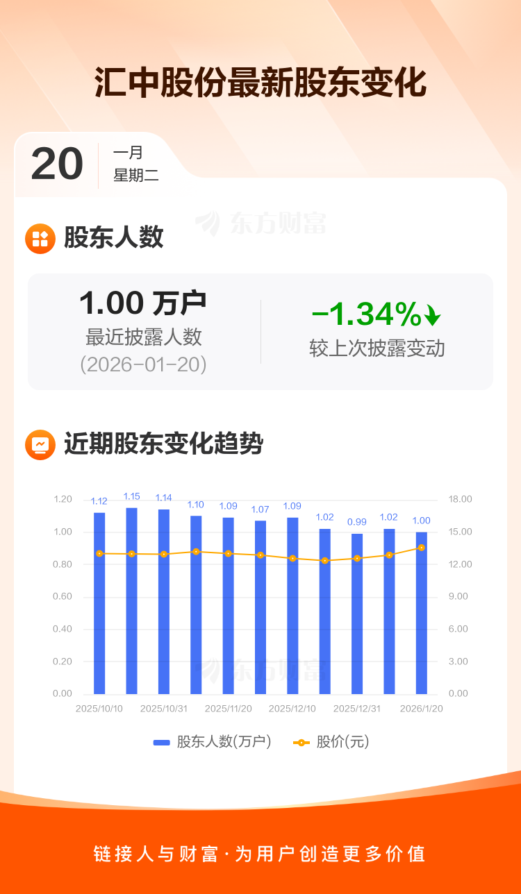 汇中股份:截至1月20日最新股东户数1.00万户,较上期减少1.34%