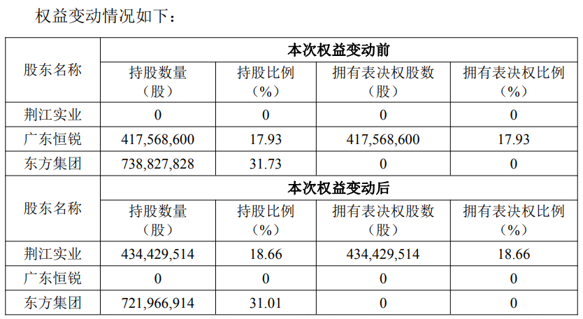 12月8日晚间,ST易事特(300376)公告,广东恒锐拟将其持有公司的4.18亿股(占公司总股本的17.93%)通过协议转让的方式转让给湖北荆江实业投资集团有限公司(简称“荆江实业”),东方集团拟将其质押给广东恒锐的股份中的1686.09万股公司股份(占公司总股本的0.72%)一并转让给荆江实业。本次股份转让的转让价格为5.61元/股,股份转让总价款共计24.37亿元。同时,东方集团不可撤销地放弃其持有的公司全部股份(7.22亿股,占公司总股本的31.01%)的表决权。