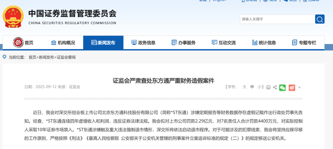 据中国证监会9月12日发布的消息,证监会近日对深交所创业板上市公司*ST东通定期报告等财务数据存在虚假记载作出行政处罚事先告知。经查,*ST东通连续四年虚增收入和利润,违反证券法律法规。证监会拟对上市公司罚款2.29亿元,对7名责任人合计罚款4400万元,对实际控制人采取10年证券市场禁入。