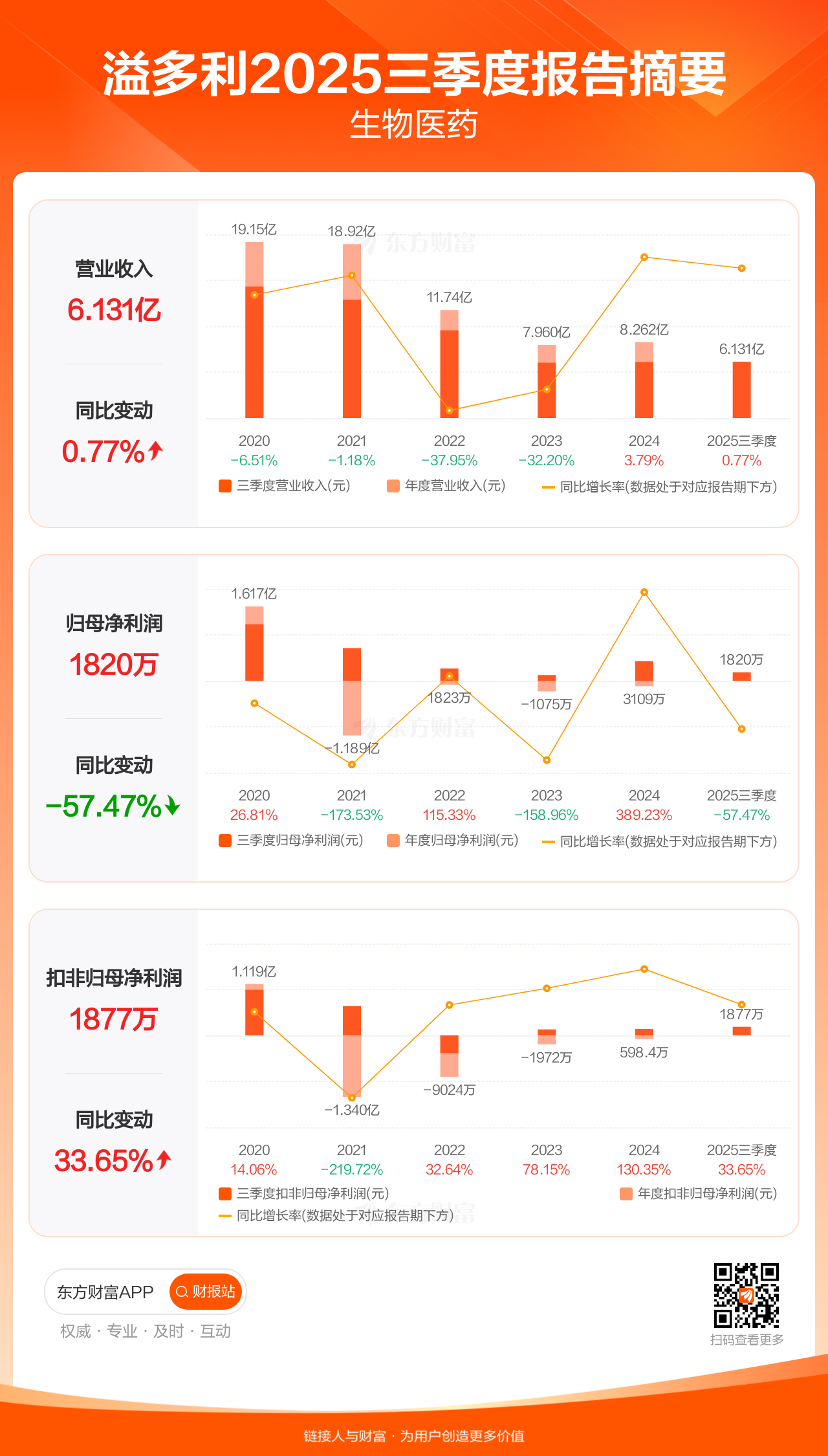 溢多利10月29日发布2025年三季报显示,公司前三季实现营业收入6.13亿元,同比增长0.77%;归母净利润1820.44万元,同比下滑57.47%;扣非归母净利润1876.73万元,同比增长33.65%。