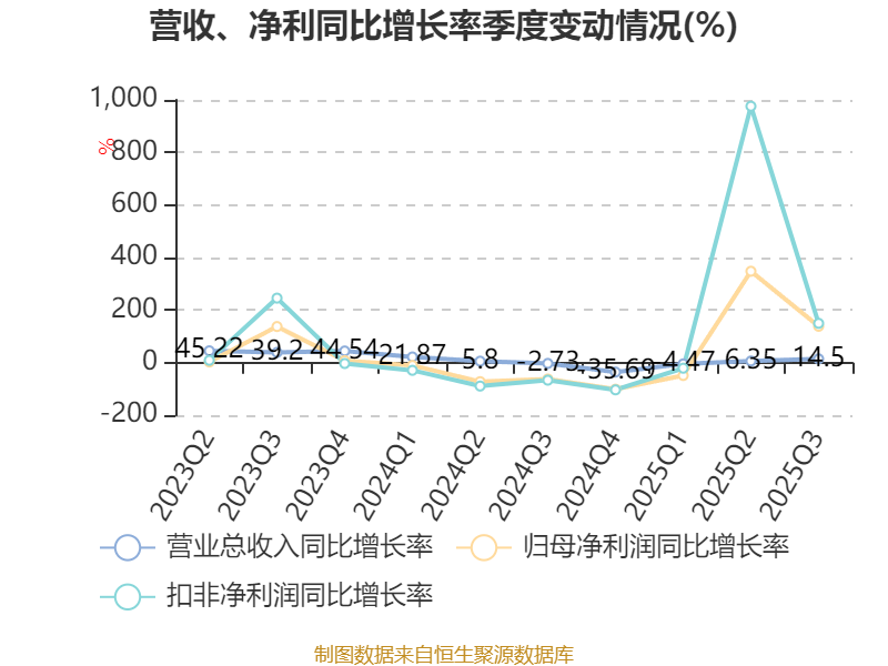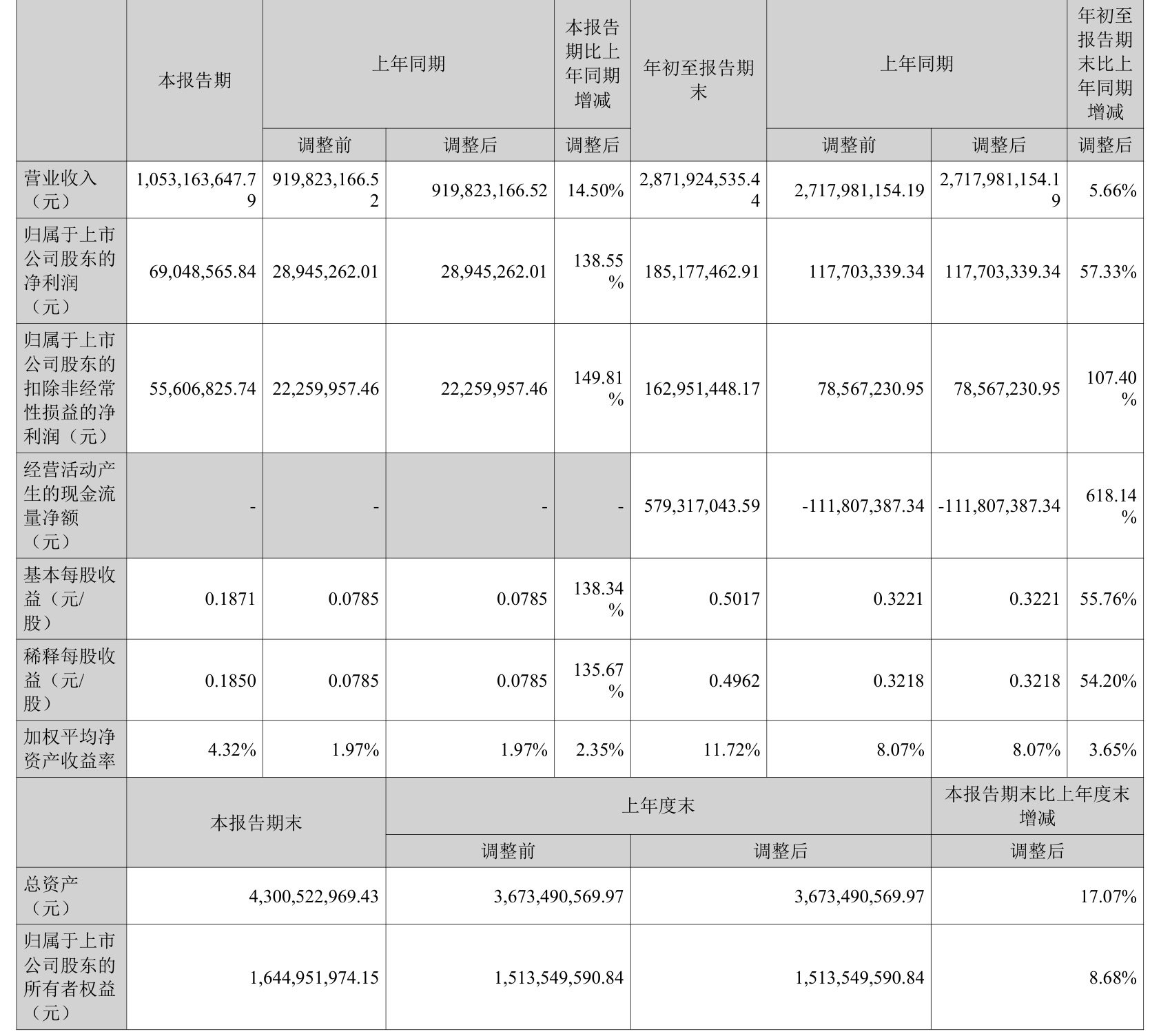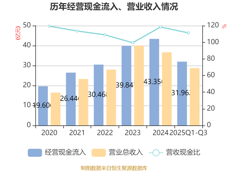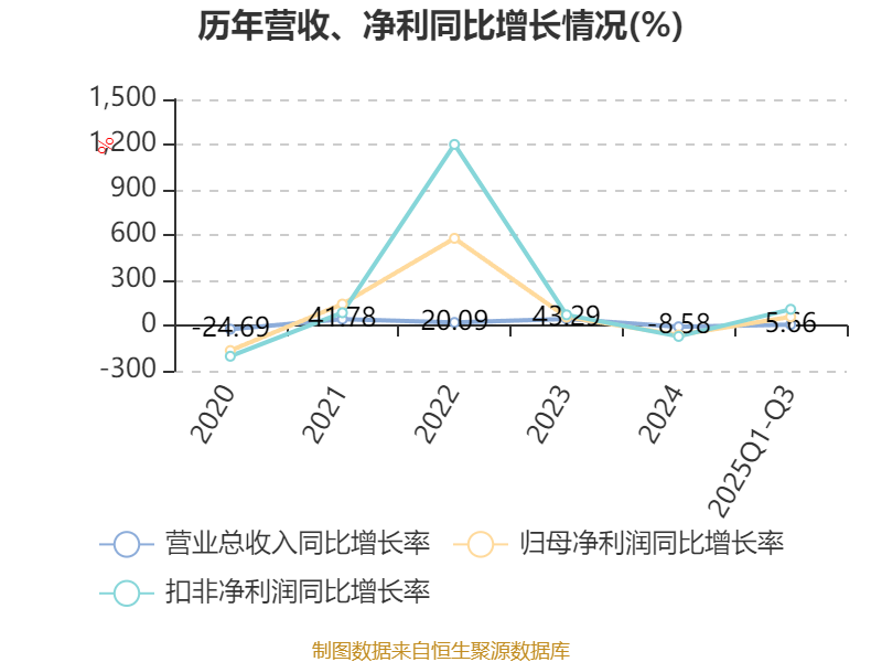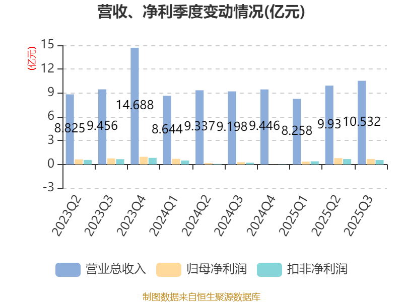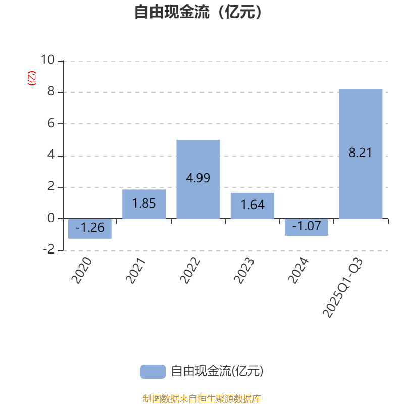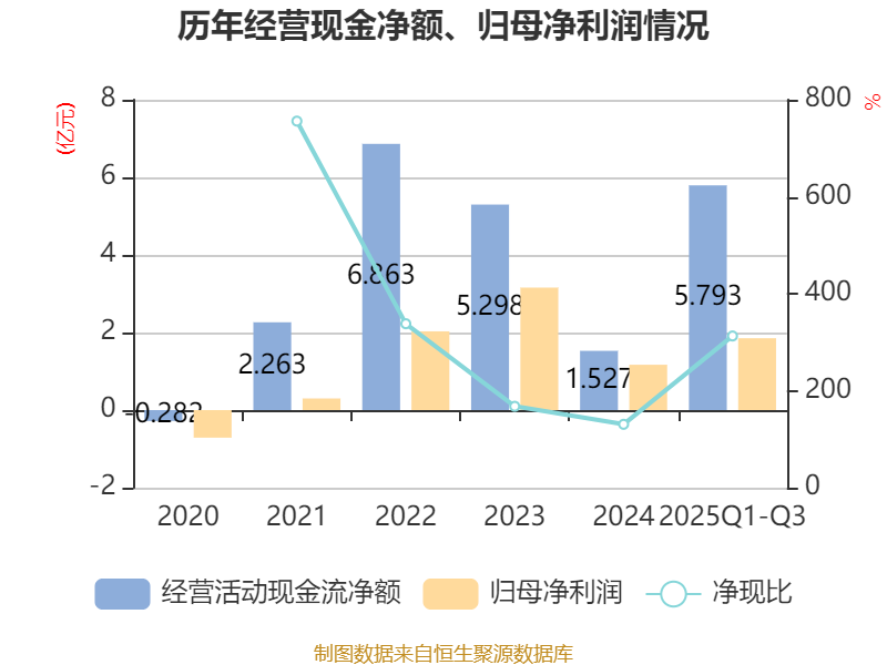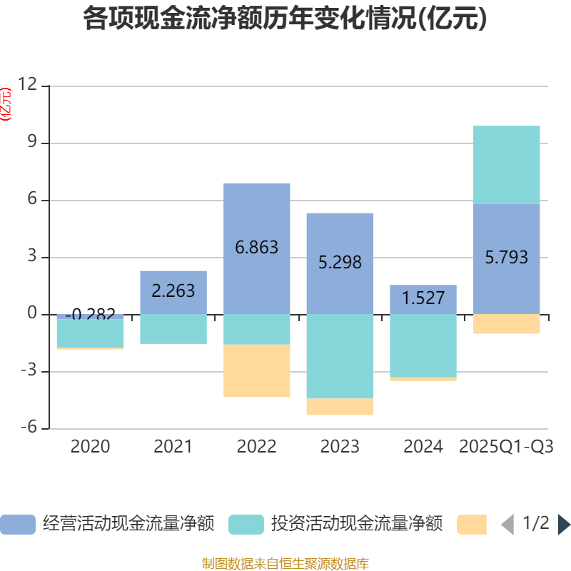 2025年前三季度,公司经营活动现金流净额为5.79亿元,同比增加6.91亿元;筹资活动现金流净额-1.03亿元,同比减少7460.27万元;投资活动现金流净额4.1亿元,上年同期为-1.1亿元。