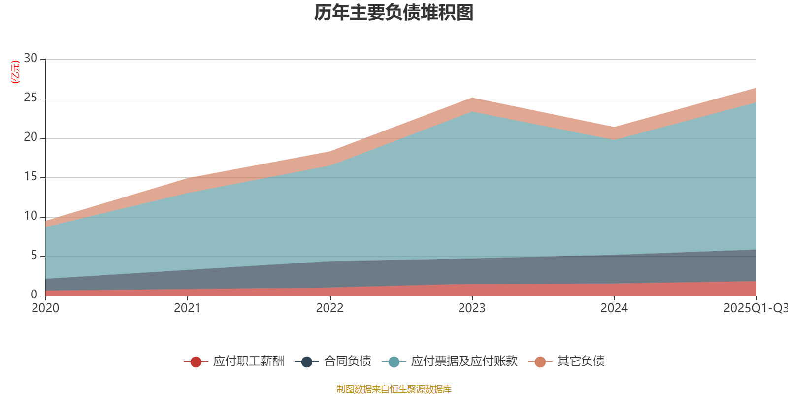 负债重大变化方面,截至2025年三季度末,公司应付票据及应付账款较上年末增加28.17%,占公司总资产比重上升3.76个百分点;合同负债较上年末增加9.7%,占公司总资产比重下降0.63个百分点;预计负债较上年末减少5.91%,占公司总资产比重下降0.32个百分点;其他应付款(含利息和股利)较上年末增加45.06%,占公司总资产比重上升0.22个百分点。