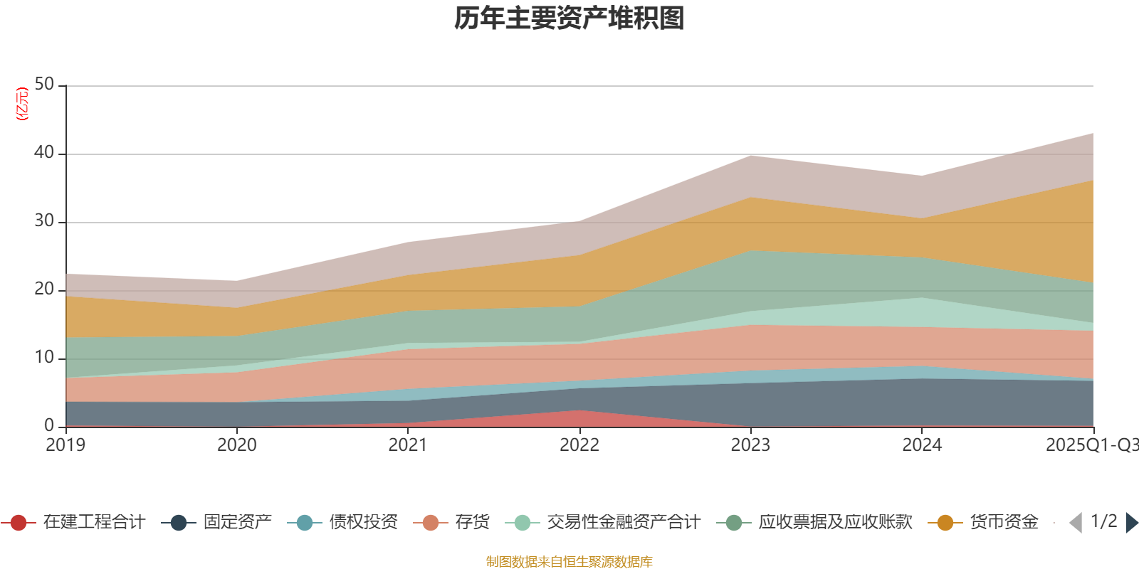 资产重大变化方面,截至2025年三季度末,公司货币资金较上年末增加162.84%,占公司总资产比重上升19.38个百分点;交易性金融资产合计较上年末减少73.45%,占公司总资产比重下降9.05个百分点;债权投资较上年末减少83.21%,占公司总资产比重下降4.36个百分点;固定资产较上年末减少4.29%,占公司总资产比重下降3.42个百分点。