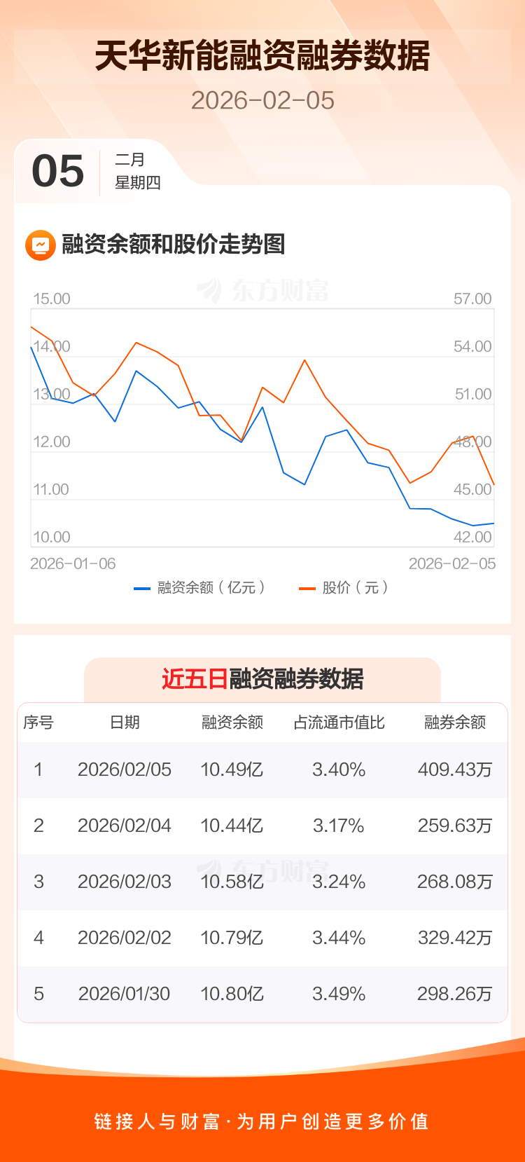 交易所最新数据显示,天华新能于2026年2月5日获融资买入6340.21万元,融资偿还5867.00万元,当日融资净买入473.21万元。目前,该股融资余额10.49亿,占流通市值比例为3.40%。