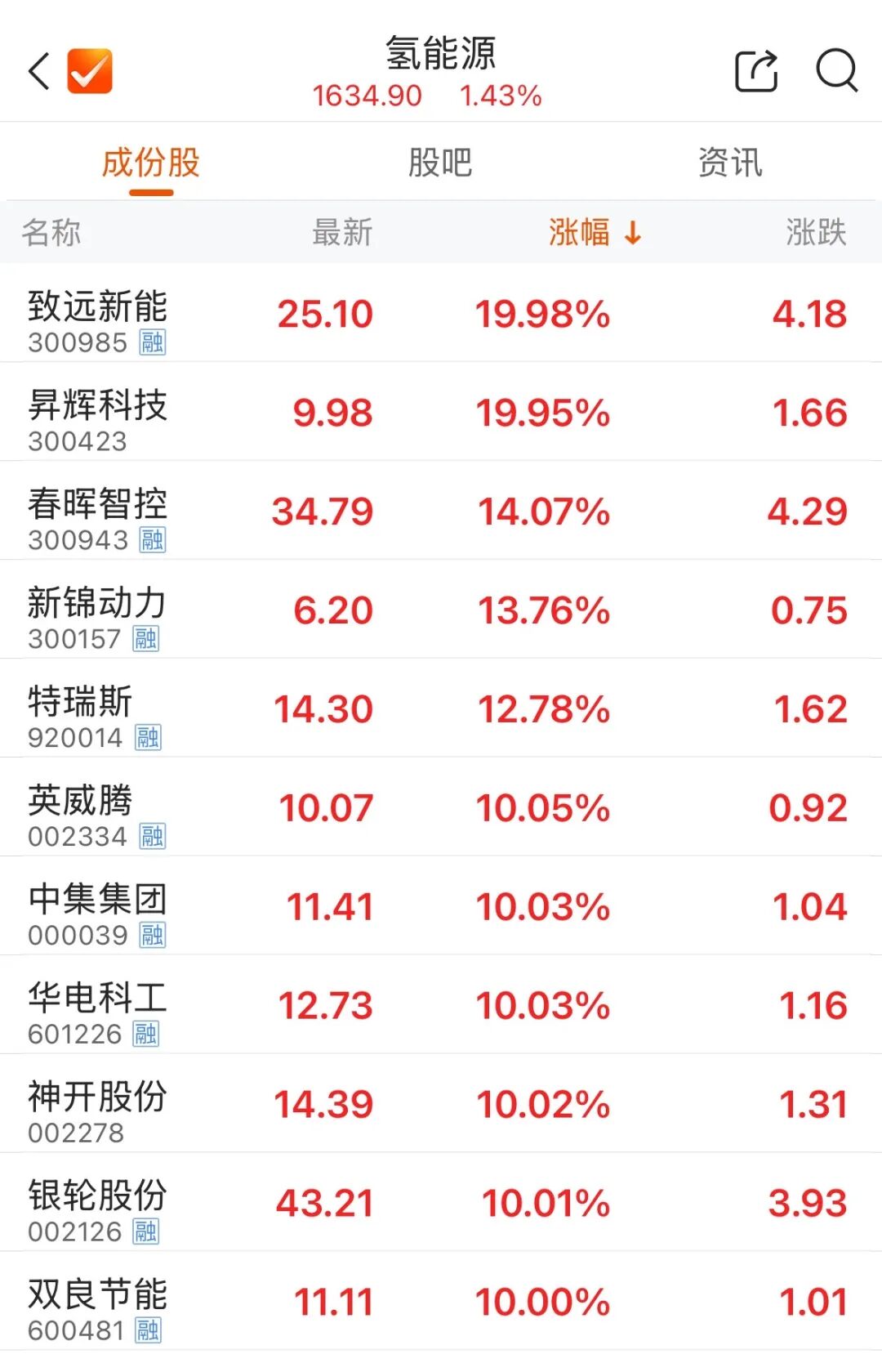 早盘,氢能源概念表现活跃。截至午间收盘,致远新能、昇辉科技以20%幅度涨停,春晖智控、新锦动力涨超10%,银轮股份、双良节能等涨停。