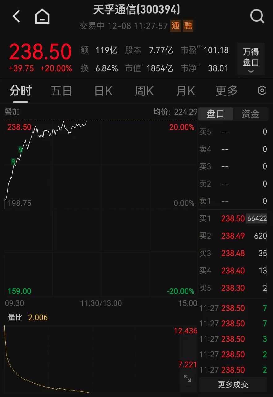 上证报中国证券网讯(记者郑维汉)12月8日,天孚通信早盘以20cm涨停收盘,报238.50元。