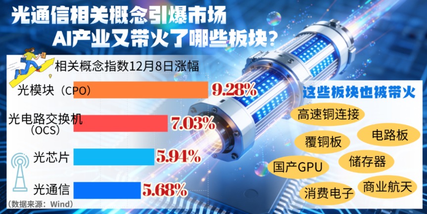 12月8日,A股光通信相关板块,包括光模块(CPO)、光电路交换机(OCS)、光芯片等概念集体飙涨,成为当天各概念板块的“领头羊”。