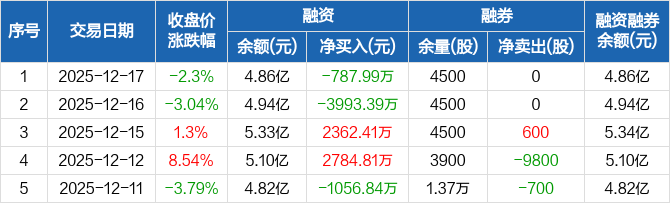 天和防务:融资净偿还787.99万元,融资余额4.86亿元(12-17)