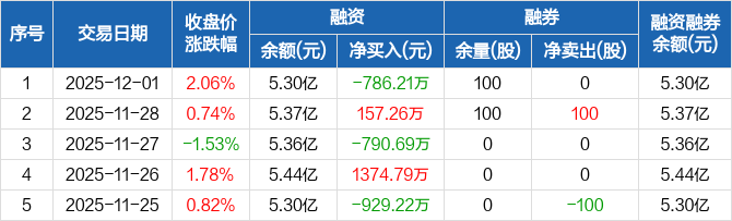 融资方面,当日融资买入3328.48万元,融资偿还4114.68万元,融资净偿还786.21万元。融券方面,融券卖出0股,融券偿还0股,融券余量100股,融券余额1386元。融资融券余额合计5.3亿元。