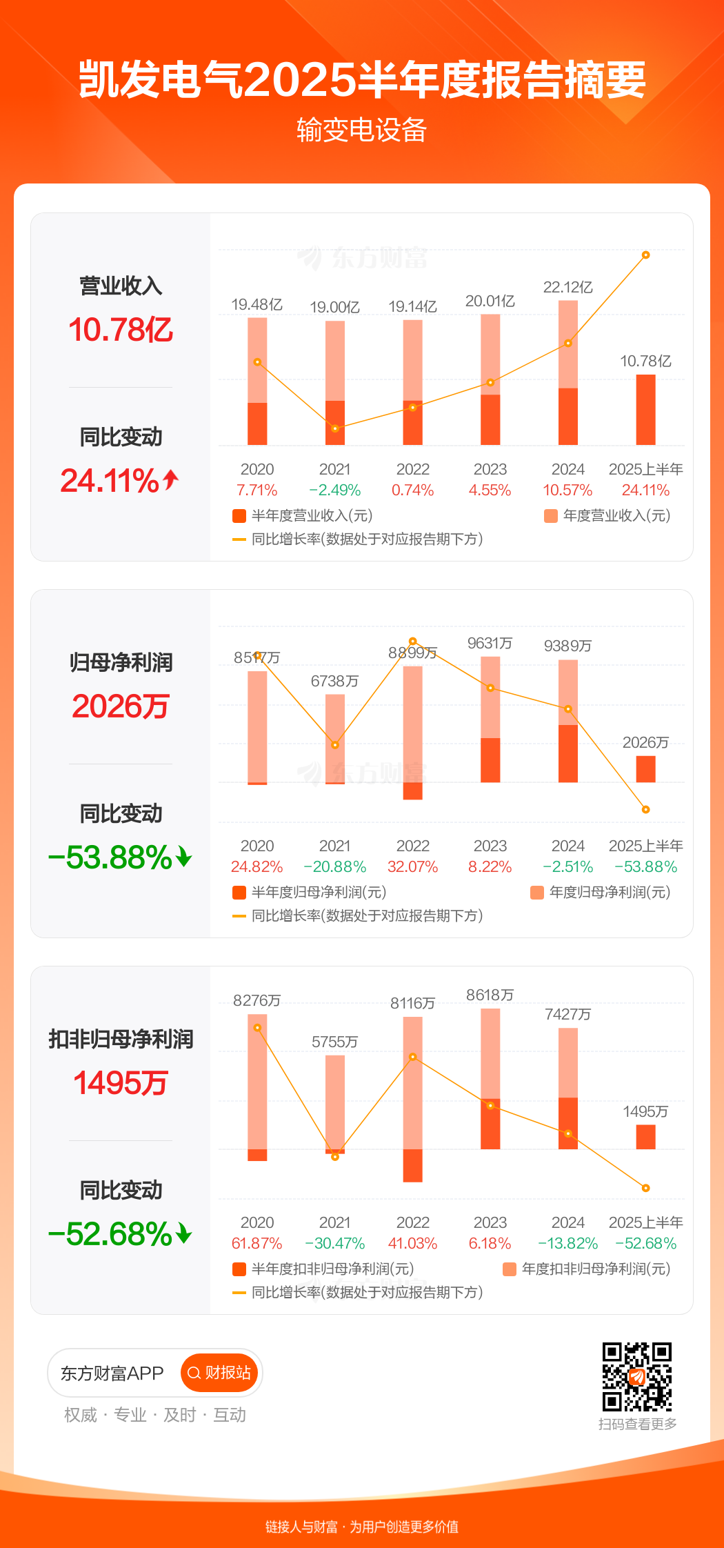 凯发电气发布2025半年度报告显示,公司上半年实现营业收入10.78亿元,同比增长24.11%;归母净利润2025.67万元,同比下滑53.88%;扣非归母净利润1495.35万元,同比下滑52.68%。