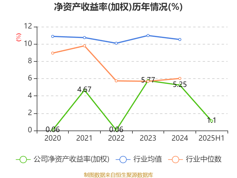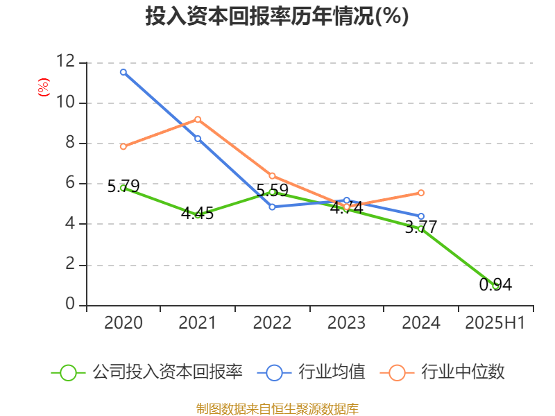 盈利能力方面, 2025年上半年公司加权平均净资产收益率为1.1%,同比下降1.35个百分点。公司2025年上半年投入资本回报率为0.94%,较上年同期下降0.93个百分点。