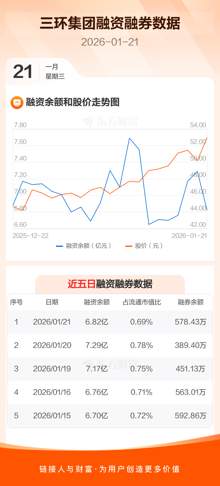 交易所最新数据显示,三环集团于2026年1月21日获融资买入9538.43万元,融资偿还1.42亿元,当日融资净偿还4675.85万元。目前,该股融资余额6.82亿,占流通市值比例为0.69%。
