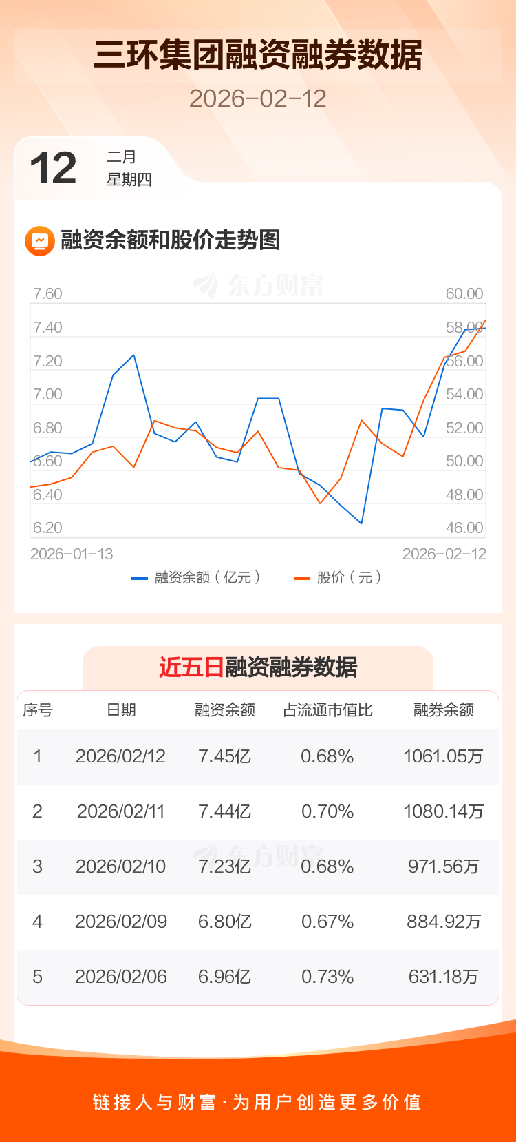 交易所最新数据显示,三环集团于2026年2月12日获融资买入1.24亿元,融资偿还1.23亿元,当日融资净买入89.28万元。目前,该股融资余额7.45亿,占流通市值比例为0.68%。