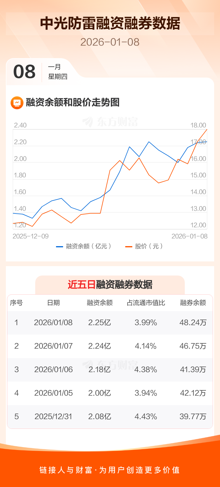 交易所最新数据显示,中光防雷于2026年1月8日获融资买入1.08亿元,融资偿还1.07亿元,当日融资净买入151.65万元。目前,该股融资余额2.25亿,占流通市值比例为3.99%。