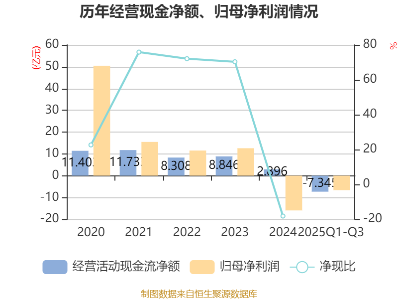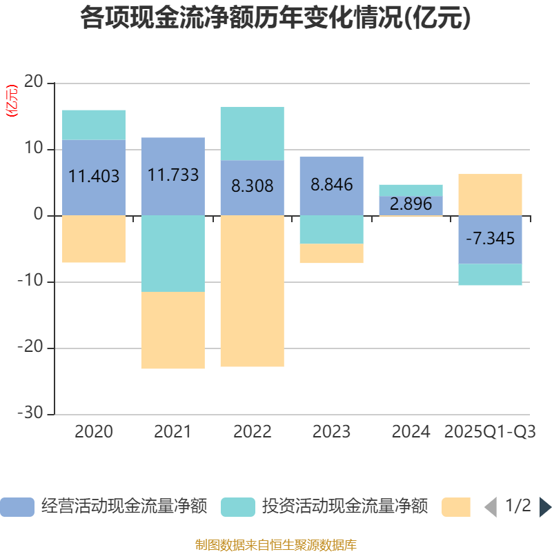 2025年前三季度,公司经营活动现金流净额为-7.34亿元,同比减少10.54亿元;筹资活动现金流净额6.24亿元,同比增加10.64亿元;投资活动现金流净额-3.22亿元,上年同期为4769.3万元。