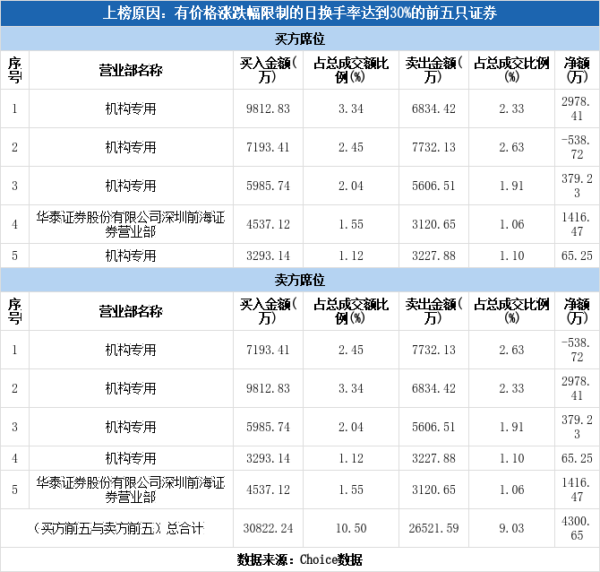 龙虎榜数据显示,今日共8个机构席位出现在龙虎榜单上,分别位列买一、买二、买三、买五、卖一、卖二、卖三、卖四,合计净买入2884.18万元,占龙虎榜净买额的67.06%。除此之外还有顺灏股份、富信科技、航宇科技等42只个股榜单上出现了机构的身影,其中18家呈现机构净买入,获净买入最多的是富信科技,净买额为2.42亿元;24家呈现机构净卖出,其中遭净卖出最高的为顺灏股份,净卖额为2.73亿元。