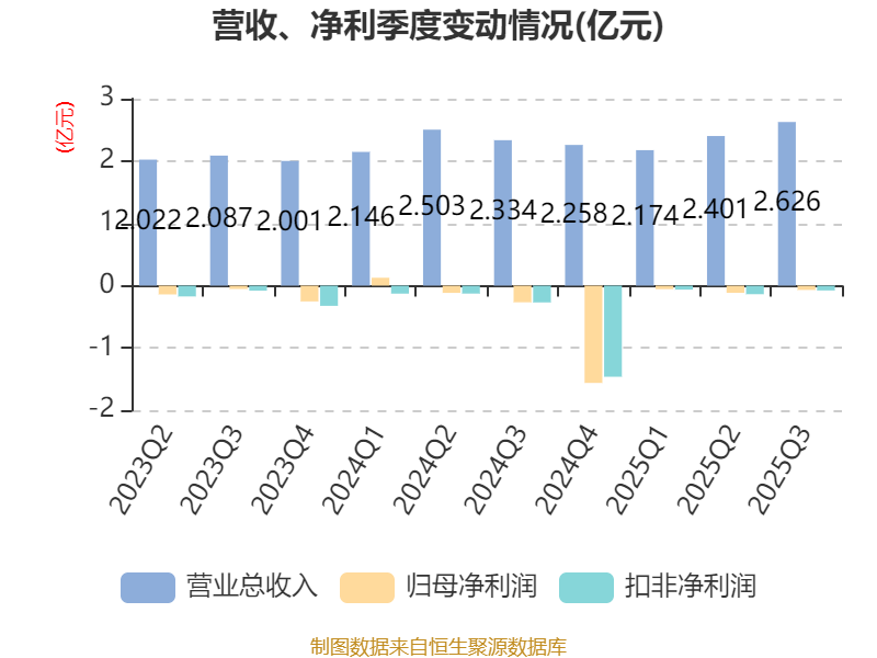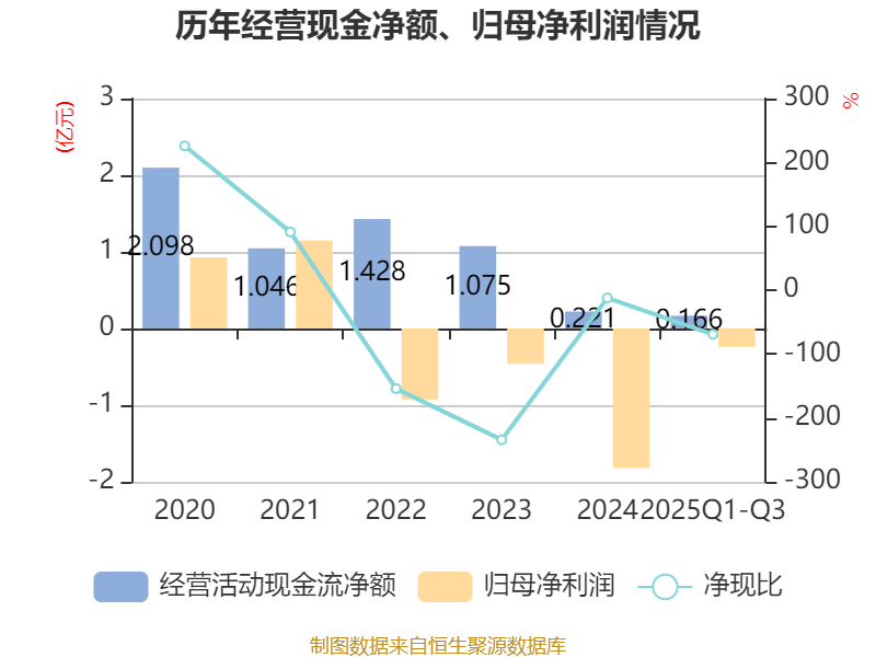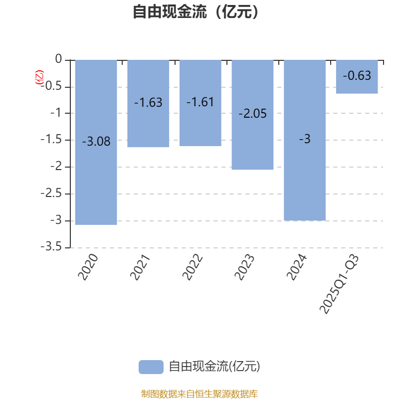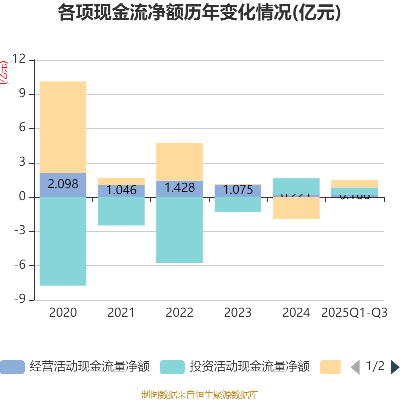 2025年前三季度,公司经营活动现金流净额为1663.23万元,同比下降54.52%;筹资活动现金流净额6309.19万元,同比增加1.65亿元;投资活动现金流净额6598.49万元,上年同期为1.39亿元。