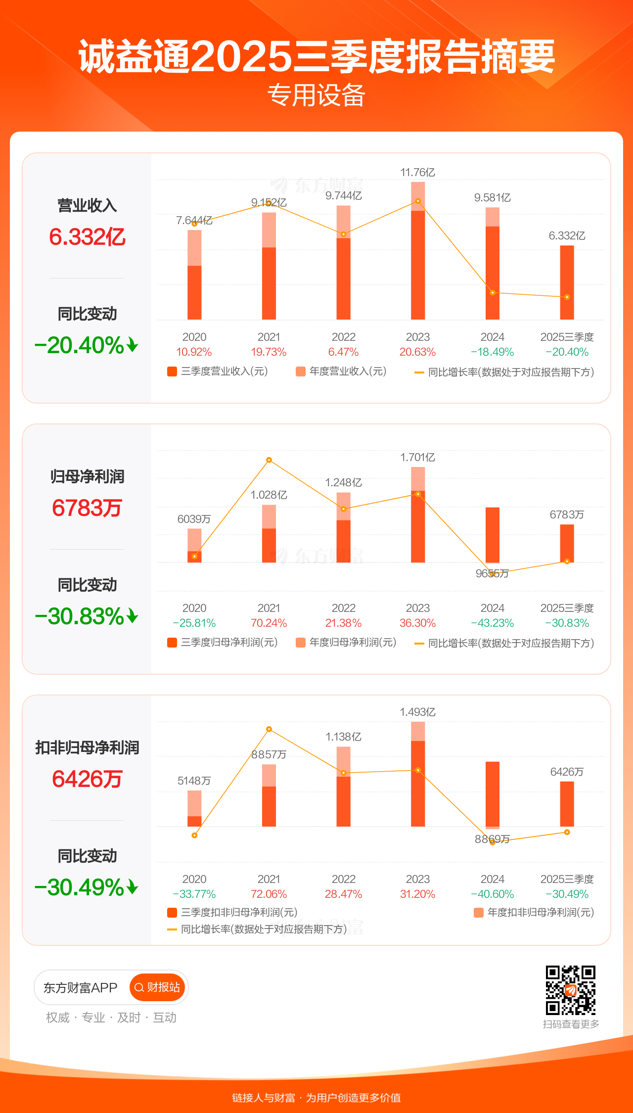 诚益通10月30日发布2025年三季报显示,公司前三季实现营业收入6.33亿元,同比下滑20.40%;归母净利润6782.84万元,同比下滑30.83%;扣非归母净利润6426.13万元,同比下滑30.49%。