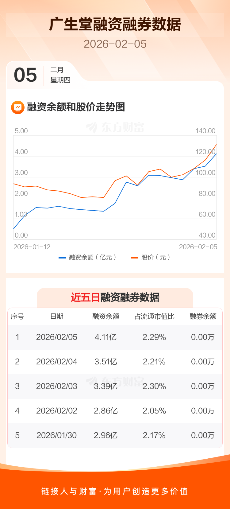 交易所最新数据显示,广生堂于2026年2月5日获融资买入2.09亿元,融资偿还1.49亿元,当日融资净买入5986.69万元。目前,该股融资余额4.11亿,占流通市值比例为2.29%。