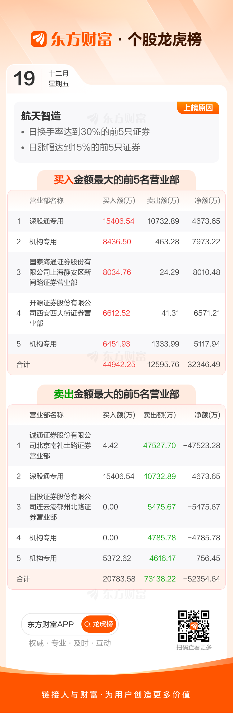 交易所2025年12月19日公布的交易公开信息显示,航天智造因成为日换手率达到30%的前5只证券、日涨幅达到15%的前5只证券上榜。航天智造当日收报26.25元,涨跌幅16.30%,偏离值42.17%,换手率42.17%,成交额41.32亿。
