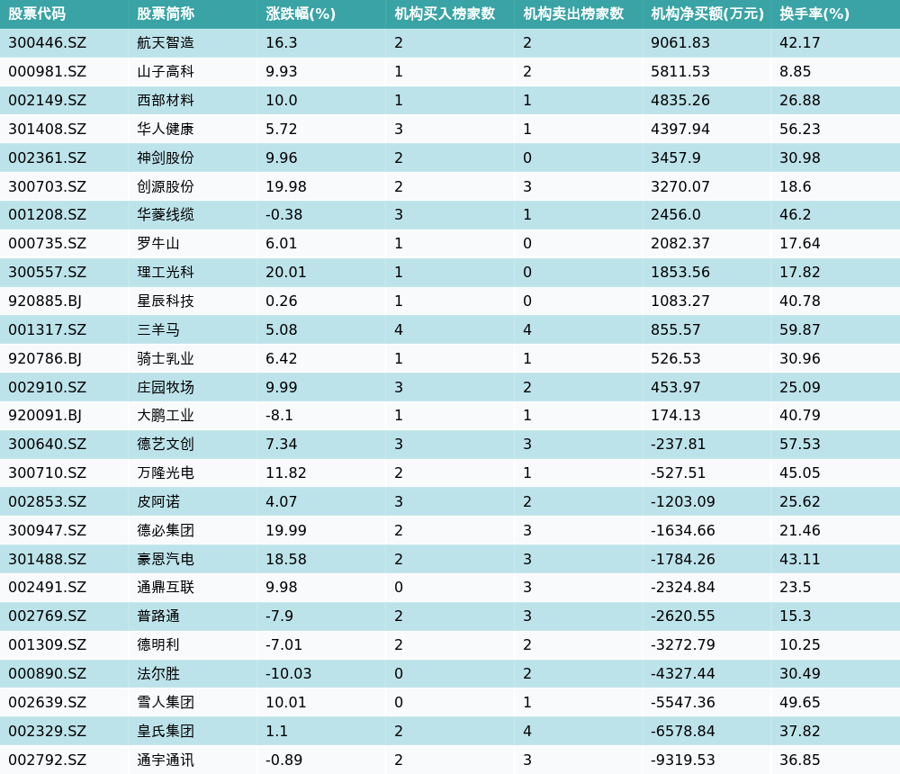 南财智讯12月19日电,南财金融终端数据显示,因当日异动登上龙虎榜的个股中,26只沪深A股龙虎榜出现了机构的身影,机构合计净买入941.25万元,具体来看,机构净买入14只个股,净卖出12只个股。其中,机构净买入前三分别为航天智造(300446.SZ)、山子高科(000981.SZ)与西部材料(002149.SZ),详情见下图:机构净卖出的个股中,前三分别为通宇通讯(002792.SZ)、皇氏集团(002329.SZ)与雪人集团(002639.SZ)。