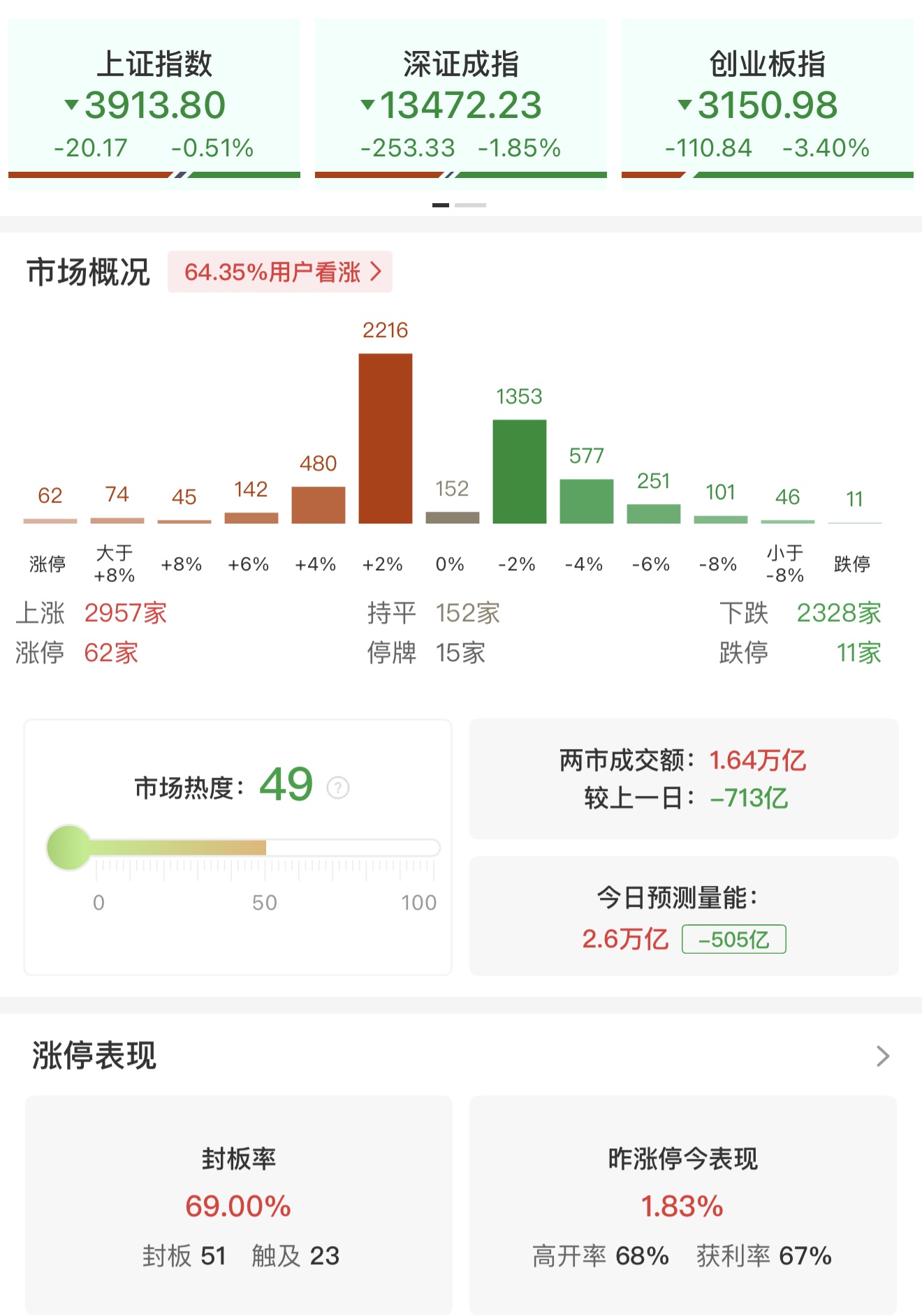 财联社10月10日电,市场早间震荡调整,三大指数集体下挫,大小指数明显分化,中小盘股表现较强。沪深两市半日成交额1.64万亿,较上个交易日缩量713亿。盘面上热点高低切换,电池、半导体热门赛道股调整,先导智能低开低走大跌超11%,前期表现强势的燕东微、华虹公司、佰维存储等芯片产业链个股集体重挫。上涨方面,今日热点集中在电网设备、核电、军工等方向,其中新特电气20cm涨停,国电南自等多股涨停。风电设备概念股逆势走强,吉鑫科技6天4板。核电板块延续强势,合锻智能3连板,安泰科技、中国核建2连板。板块方面,燃气、电网设备等板块涨幅居前,贵金属、电池、半导体等板块跌幅居前。截至收盘,沪指跌0.51%,深成指跌1.85%,创业板指跌3.40%。