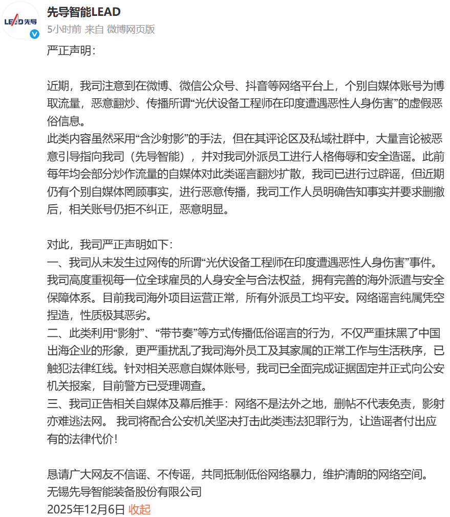 12月6日,无锡先导智能装备股份有限公司在微博发布严正声明称,近期,公司注意到在微博、微信公众号、抖音等网络平台上,个别自媒体账号为博取流量,恶意翻炒、传播所谓“光伏设备工程师在印度遭遇恶性人身伤害”的虚假恶俗信息。