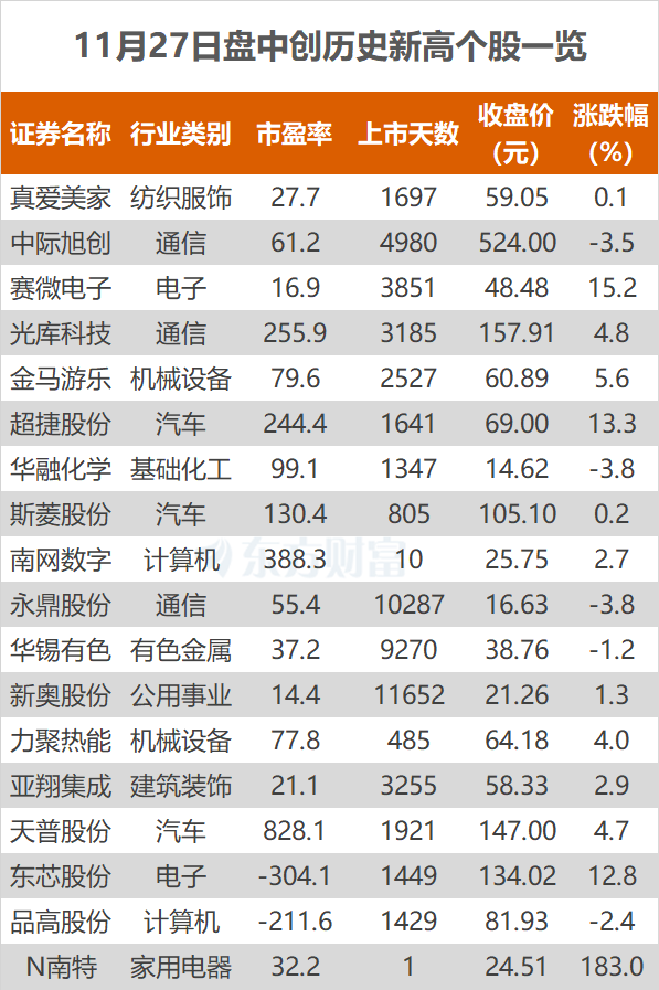 11月27日,A股三大指数今日冲高回落,截止收盘,沪指涨0.29%,收报3875.26点;深证成指跌0.25%,收报12875.19点;创业板指跌0.44%,收报3031.30点。东方财富Choice数据显示,今日有18只个股盘中股价创历史新高,分别为赛微电子、中际旭创等。
