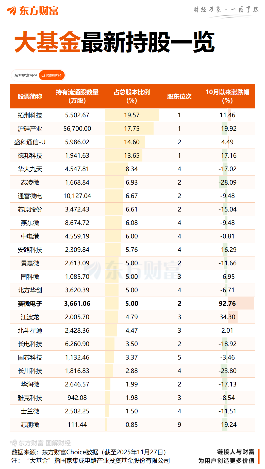 注:截至11月24日,大基金持有赛微电子5.88%股份,为公司的第二大股东。赛微电子11月24日公告,大基金于2025年9月23日至11月24日通过集中竞价方式合计减持783.6718万股,占公司总股本的1.07%。持股比例由6.95%降至5.88%,减持比例触及1%整数倍。