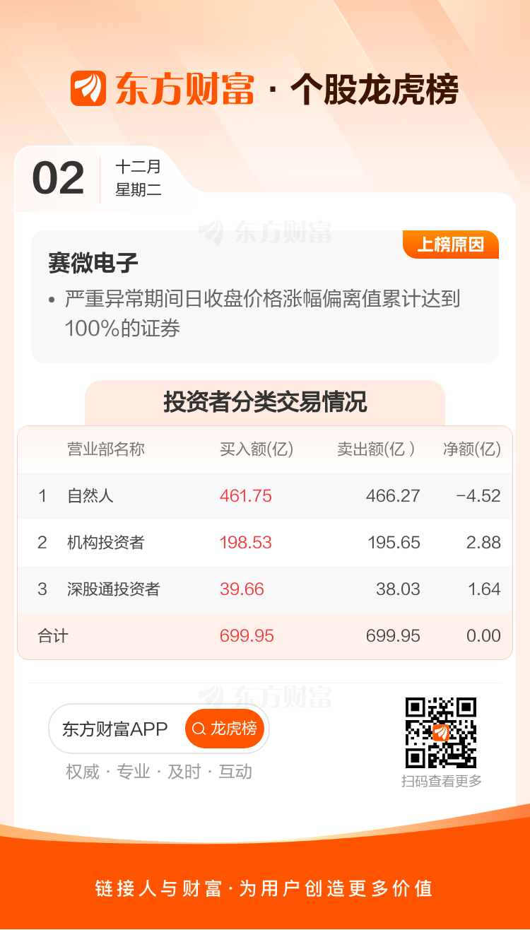 交易所2025年12月2日公布的交易公开信息显示,赛微电子因成为日涨幅达到15%的前5只证券、严重异常期间日收盘价格涨幅偏离值累计达到100%的证券上榜。赛微电子当日收报58.43元,涨跌幅15.27%,偏离值15.27%,换手率30.23%,成交额99.74亿。严重异常期间11月19日至12月2日,期间涨幅118.35%,累计偏离值119.00%,区间成交额699.95亿。