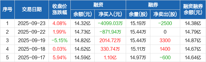 赢合科技:融资净偿还4099.03万元,融资余额14.32亿元(09-23)