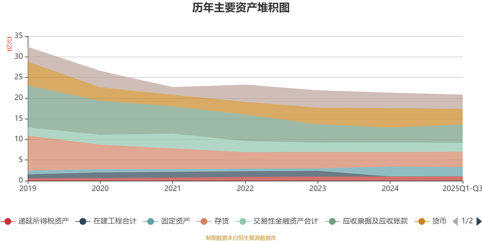 资产重大变化方面,截至2025年三季度末,公司应收票据及应收账款较上年末增加22.3%,占公司总资产比重上升4.27个百分点;货币资金较上年末减少18.87%,占公司总资产比重下降3.74个百分点;其他流动资产较上年末增加1273.08%,占公司总资产比重上升2.22个百分点;一年内到期的非流动资产较上年末减少100%,占公司总资产比重下降1.58个百分点。