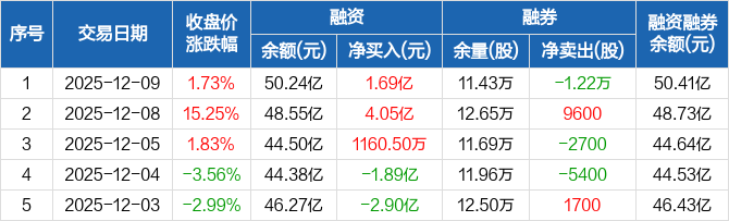 融资方面,当日融资买入12.3亿元,融资偿还10.61亿元,融资净买入1.69亿元,连续3日净买入累计5.86亿元。融券方面,融券卖出1200股,融券偿还1.34万股,融券余量11.43万股,融券余额1666.95万元。融资融券余额合计50.41亿元。