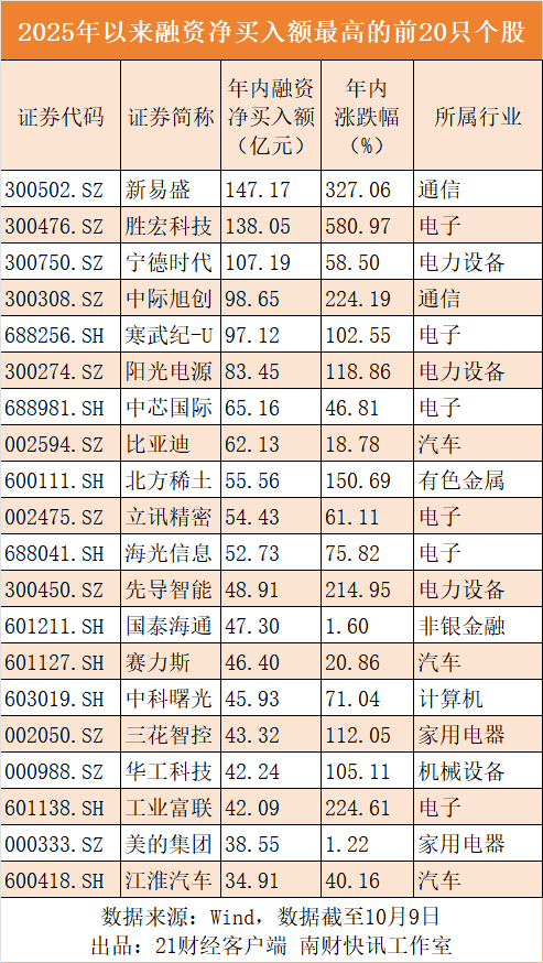从年内融资净买入总额来看,截至10月9日,今年以来获超50亿元融资净买入的股票有11只,其中有3只融资净买入额超过了100亿元。获融资客净买入前三的个股分别是新易盛、胜宏科技和宁德时代,年内涨幅分别达到了327.06%、580.97%和58.50%。三家企业分别是光模块、AI-PCB和新能源行业龙头,在近期轮动行情中均为热门板块。