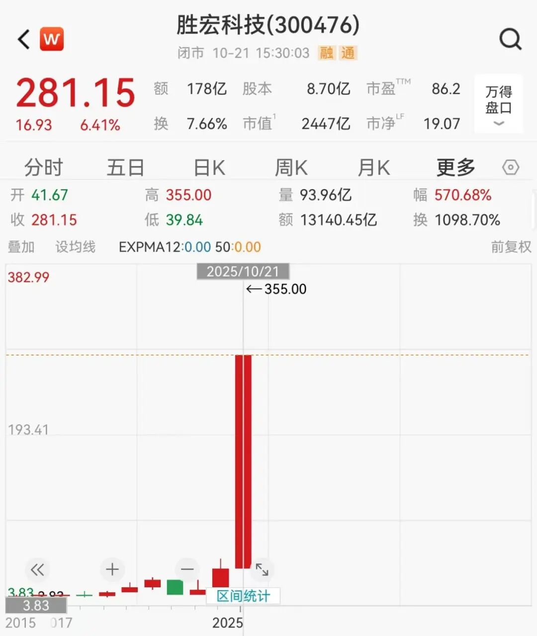 今年以来,胜宏科技股价累计涨幅超570%,最新市值为2447亿元。