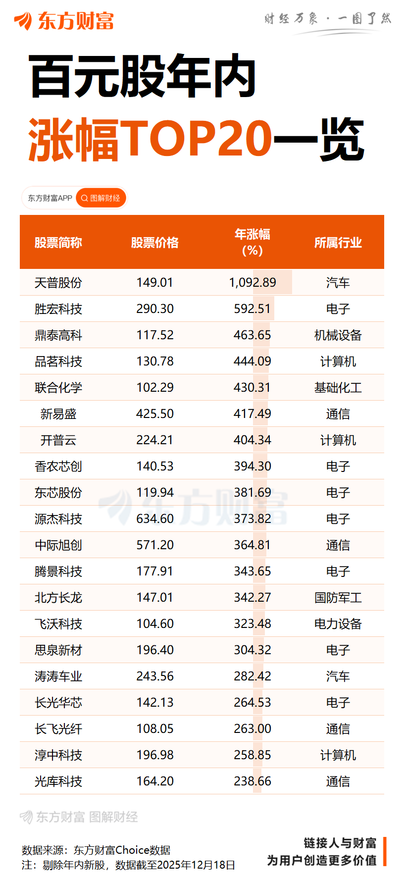 百元股阵营扩容不仅是一数量标志,也是新一轮强劲结构性行情的集中体现,反映了科技风格企业在当前市场中的定价优势。而这批百元股“新贵”的股价年内平均涨幅高达164%,成为年内毋庸置疑的“造富”高地。其中,天普股份以超过10倍的涨幅(1067.3%)夺魁,胜宏科技(300476.SZ)、仕佳光子(688313.SH)等个股涨幅也超过5倍,凸显出强烈的赚钱效应。
