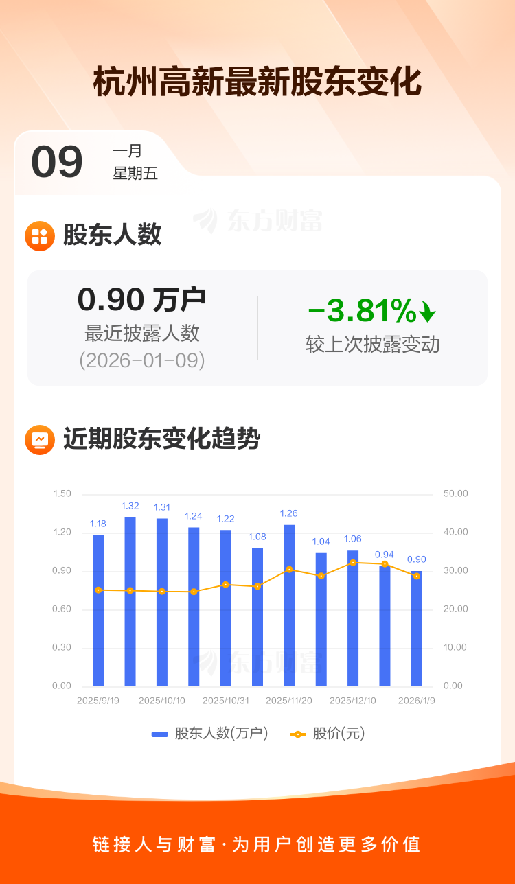 杭州高新最新披露数据显示,截至1月9日公司股东户数为8996户,较上期(2025年12月19日)减少356户,降幅为3.81%。户均持有流通股数量由上期的1.35万股上升至1.41万股,户均持股金额由上期的43.13万元减少至40.37万元。