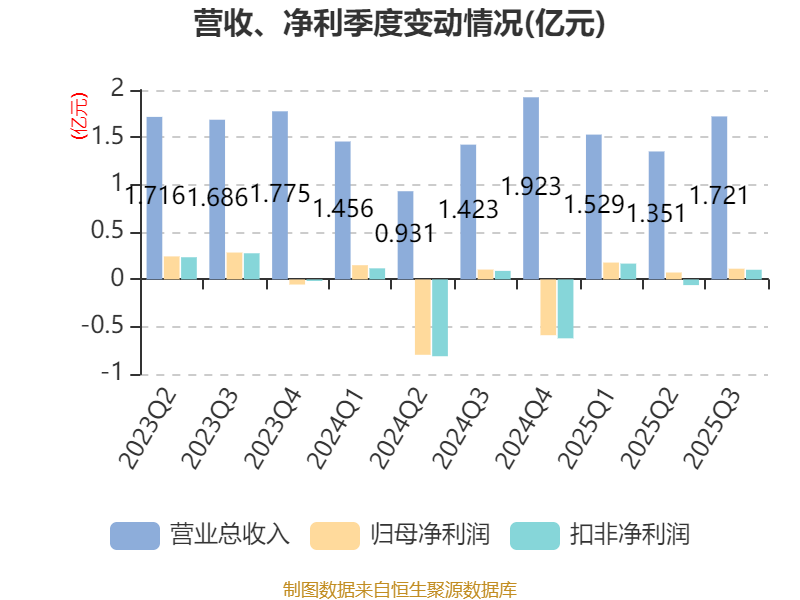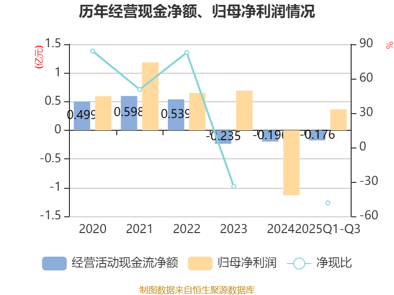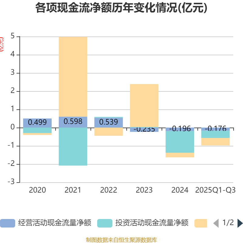 2025年前三季度,公司经营活动现金流净额为-1761.07万元,同比增加2704.54万元;筹资活动现金流净额-4097.25万元,同比减少755.22万元;投资活动现金流净额-3940.85万元,上年同期为-6988.82万元。