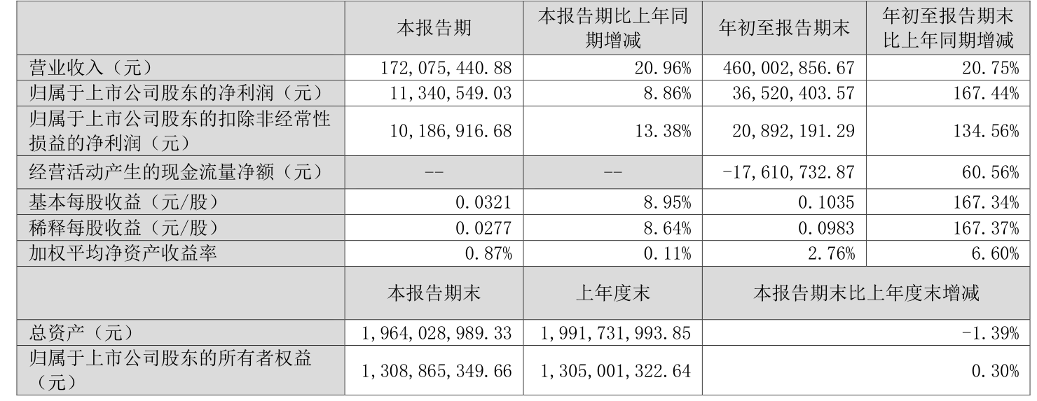 中证智能财讯光力科技(300480)10月30日披露2025年第三季度报告。前三季度公司实现营业总收入4.6亿元,同比增长20.75%;归母净利润3652.04万元,同比扭亏;扣非净利润2089.22万元,同比扭亏;经营活动产生的现金流量净额为-1761.07万元,上年同期为-4465.62万元;报告期内,光力科技基本每股收益为0.1035元,加权平均净资产收益率为2.76%。