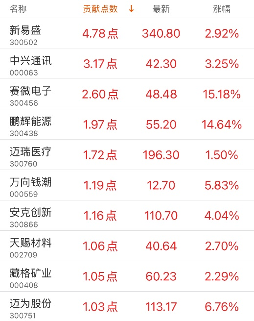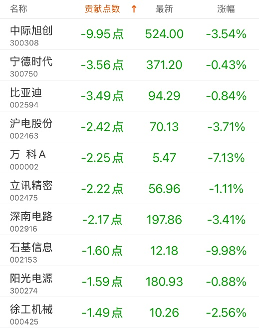 对深证成指贡献点数最多的个股是新易盛,贡献4.78点,该股当日涨2.92%,收盘价340.8元;拖累点数最多的个股是中际旭创,拖累9.95点,该股当日跌3.54%,收盘价524元。