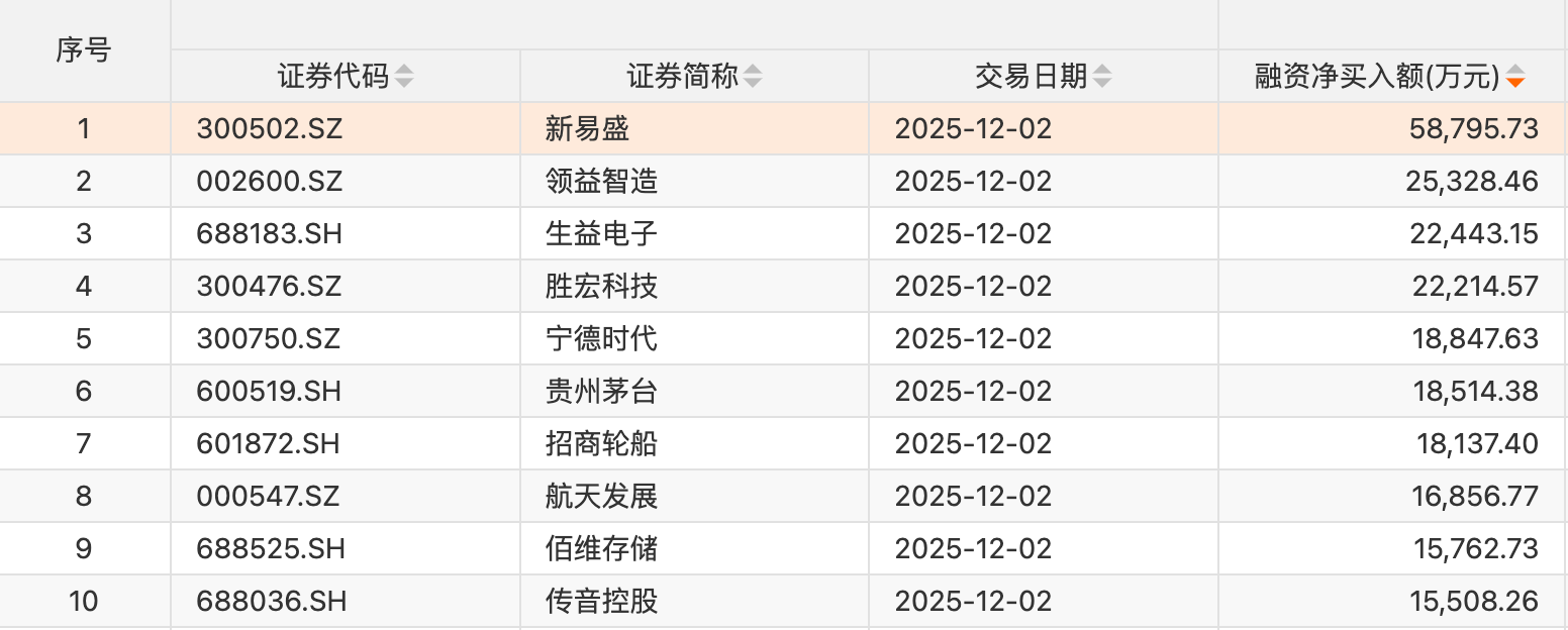 个股方面,22只个股获融资净买入额超1亿元。新易盛获融资净买入额居首,净买入5.88亿元;融资净买入金额居前的还有领益智造、生益电子、胜宏科技、宁德时代、贵州茅台、招商轮船、航天发展等。