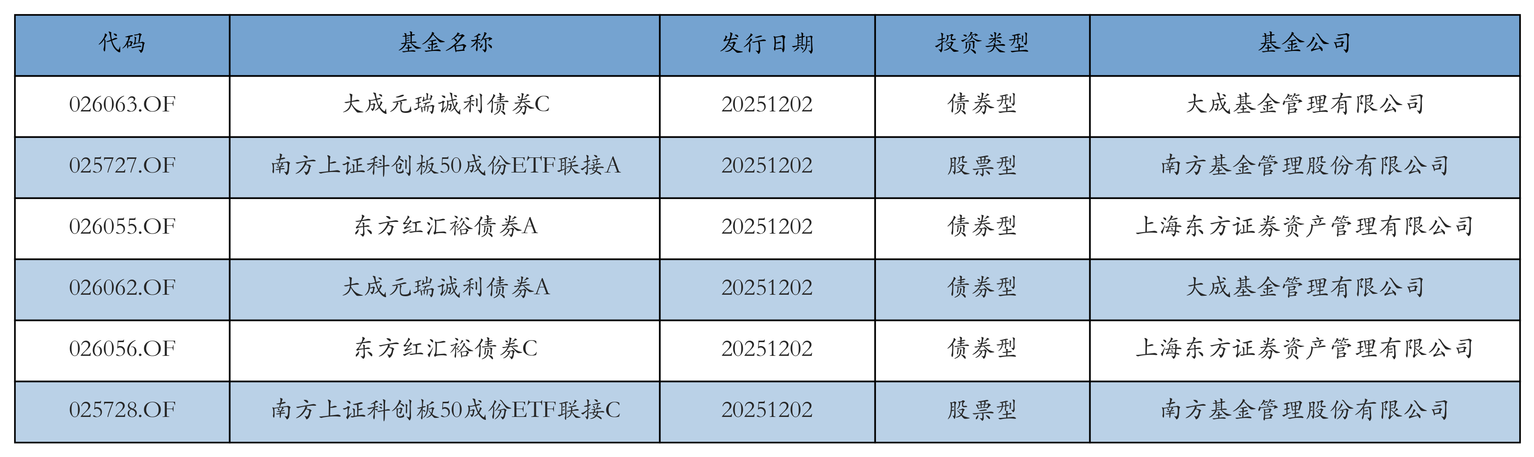 昨日有6只新基金发行,分别为:大成元瑞诚利债券C、南方上证科创板50成份ETF联接A、东方红汇裕债券A、大成元瑞诚利债券A、东方红汇裕债券C、南方上证科创板50成份ETF联接C,详情见下表: