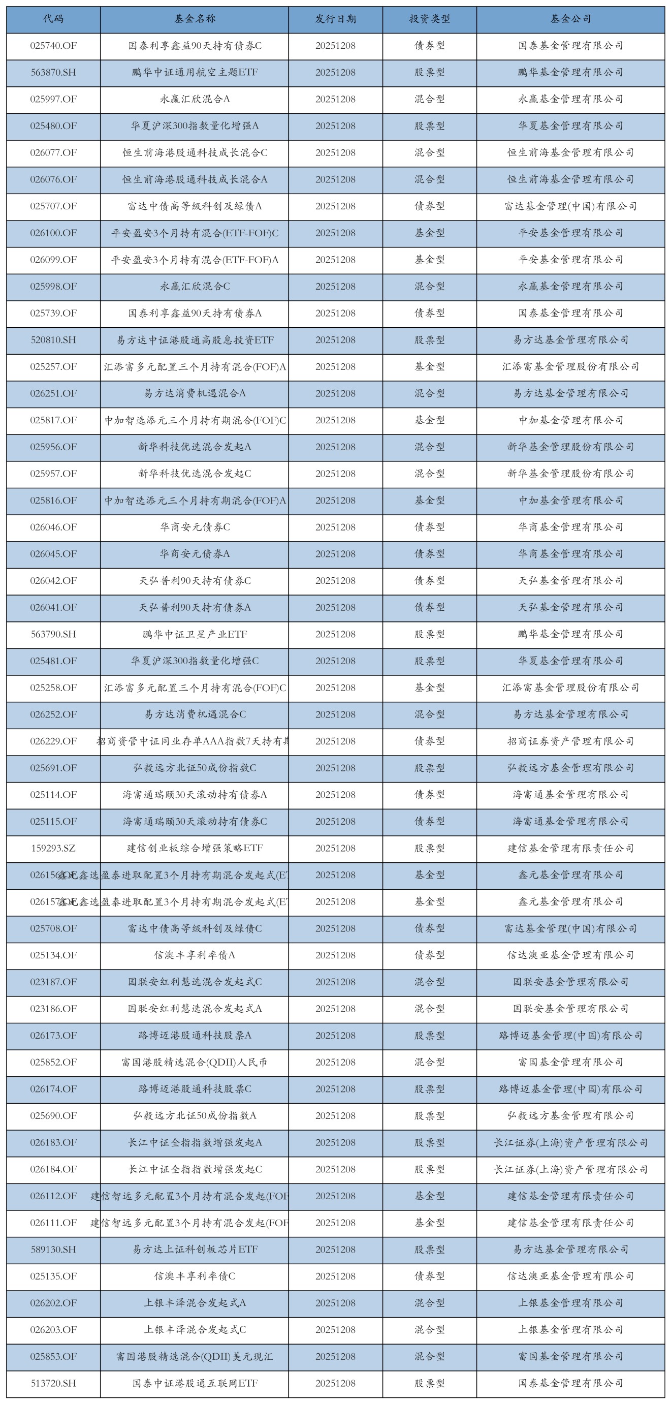 昨日有51只新基金发行,分别为:国泰利享鑫益90天持有债券C、鹏华中证通用航空主题ETF、永赢汇欣混合A、华夏沪深300指数量化增强A、恒生前海港股通科技成长混合C、恒生前海港股通科技成长混合A、富达中债高等级科创及绿债A、平安盈安3个月持有混合(ETF-FOF)C、平安盈安3个月持有混合(ETF-FOF)A、永赢汇欣混合C、国泰利享鑫益90天持有债券A等,详情见下表: