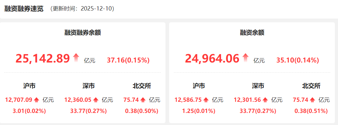 上证报中国证券网讯(卢伊记者徐蔚)12月10日,A股两融余额为25142.89亿元,较上一交易日增加37.16亿元,占A股流通市值比例为2.60%。当日两融交易额为1812.93亿元,较上一交易日减少218.27亿元,占A股成交额的10.11%。