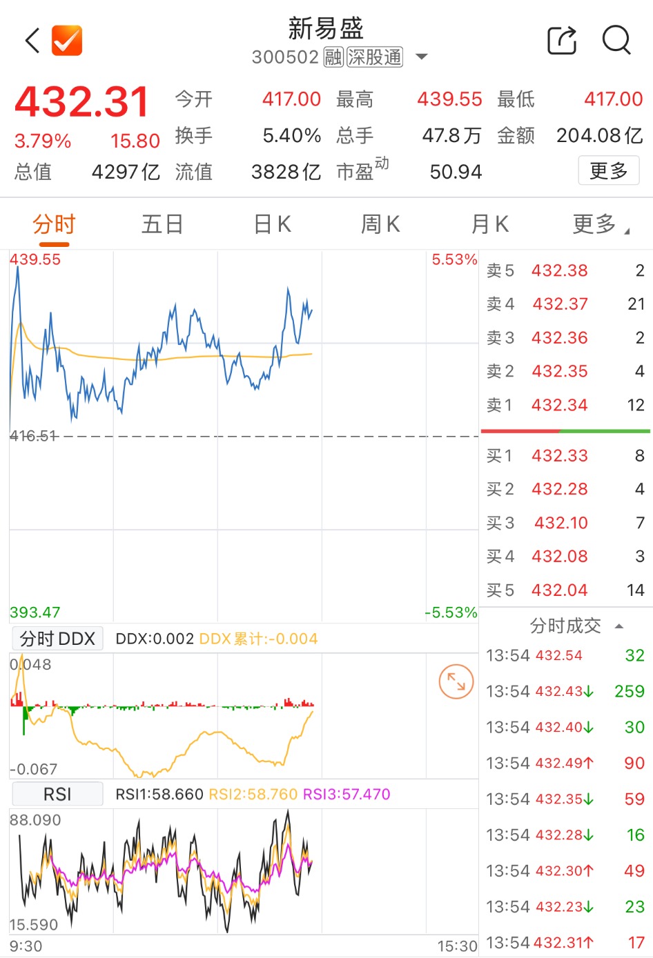 12月12日,新易盛成交额超200亿元。截至13时55分,该股涨3.79%,成交额达204亿元。