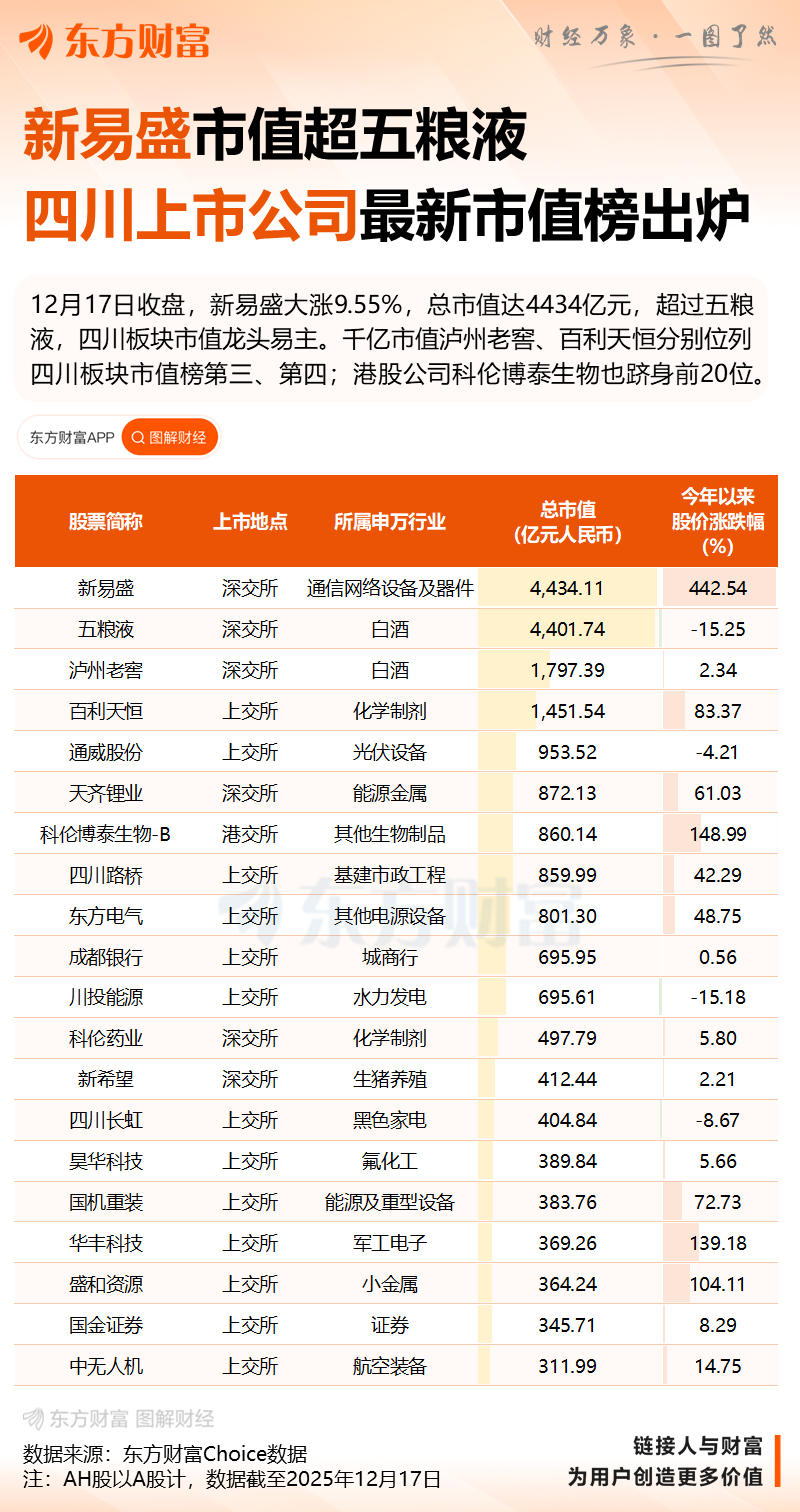 新易盛力夺四川板块市值龙头!一图速览四川上市公司市值TOP20