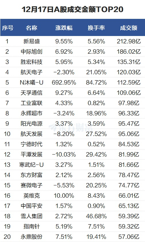 活跃个股:新易盛成交213亿元 N沐曦-U换手率85%