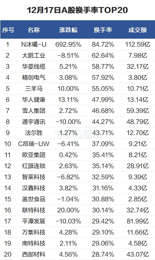 当天换手率最高的个股为N沐曦-U,全天换手率84.72%。大鹏工业紧随其后,全天换手率62.64%。
