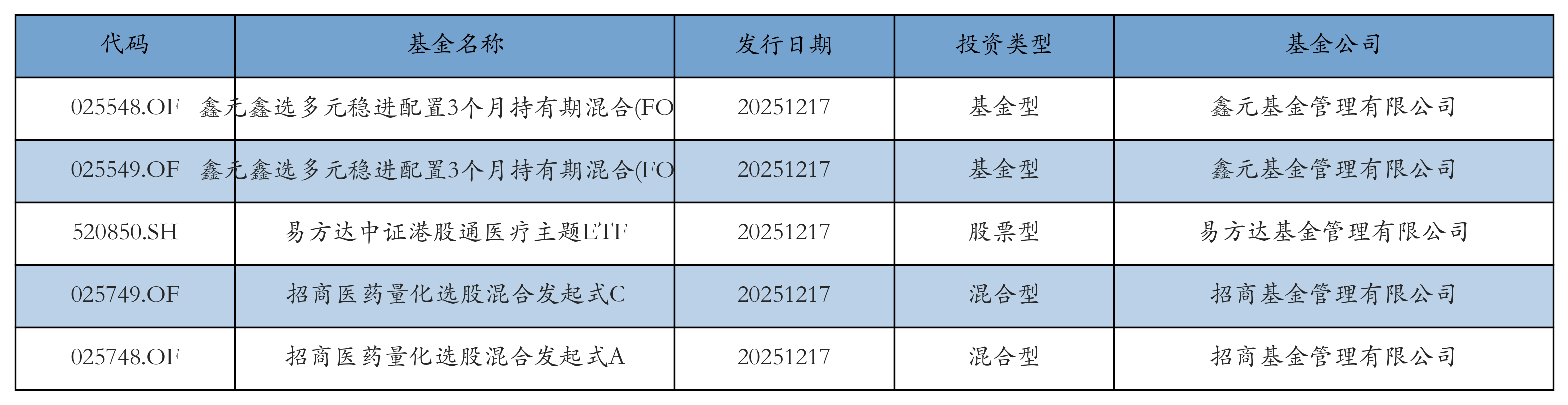 昨日有5只新基金发行,分别为:鑫元鑫选多元稳进配置3个月持有期混合(FOF)A、鑫元鑫选多元稳进配置3个月持有期混合(FOF)C、易方达中证港股通医疗主题ETF、招商医药量化选股混合发起式C、招商医药量化选股混合发起式A,详情见下表: